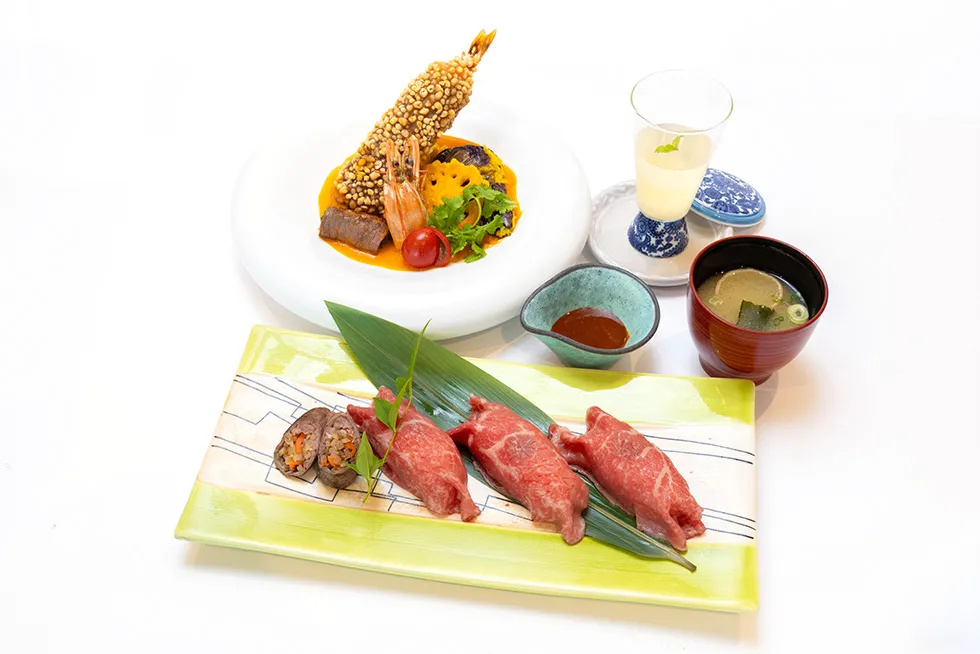 岡山牛炙り寿司と肉巻き海老の金棒揚げ敷雲丹ソース